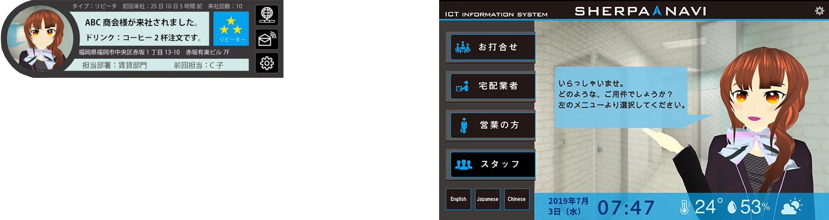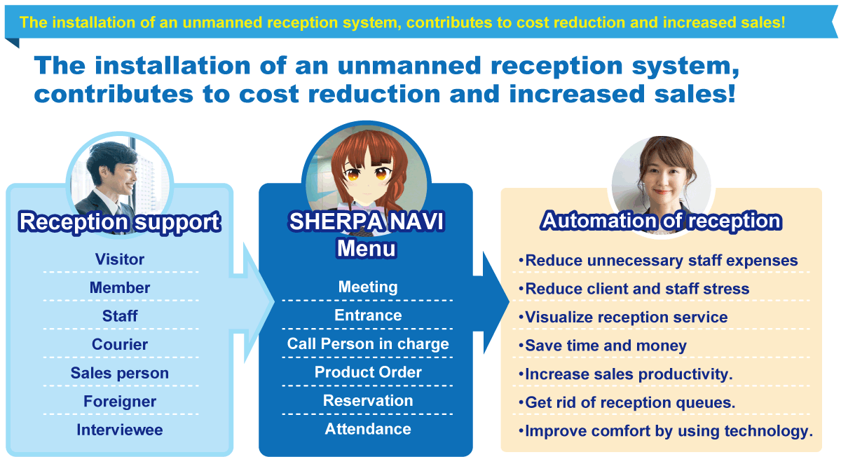 SHERPA NAVI can be used not only for office reception but also for hotels, shops, events, exhibitions, showrooms, hospitals, restaurants, etc.